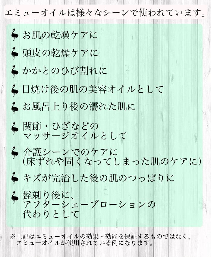 ◆本品はエミューオイルのみを使用した商品の為、気温が低いとオイルが固まることがあります。出にくい場合は手などで温めてお使いください。