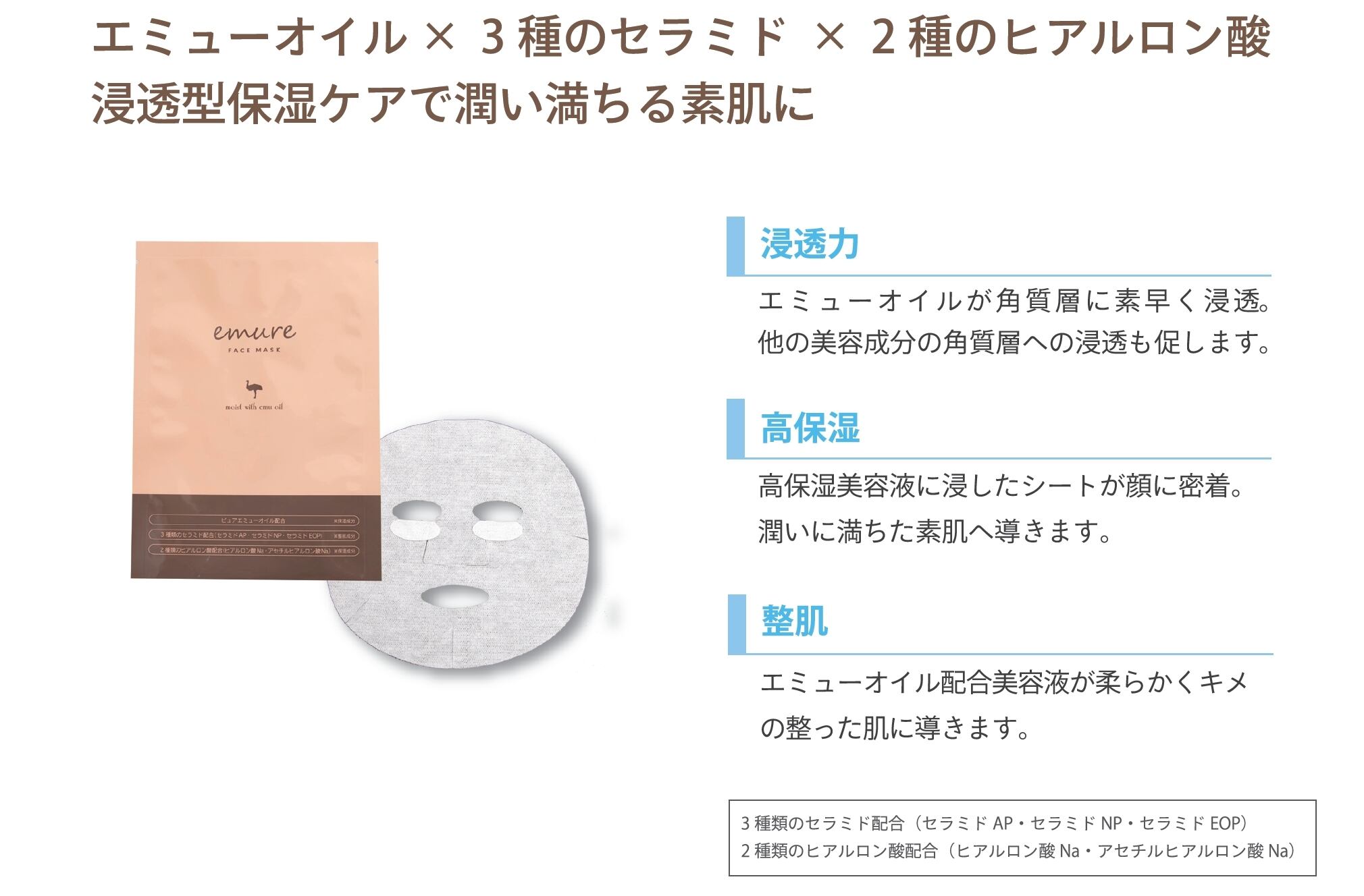 エミューオイルに含まれる脂肪酸には優れた保湿効果があり、肌を守り整えます。人の皮脂に極めて近い成分のため角質層まで素早く浸透して、べたつかずに肌になじみます。